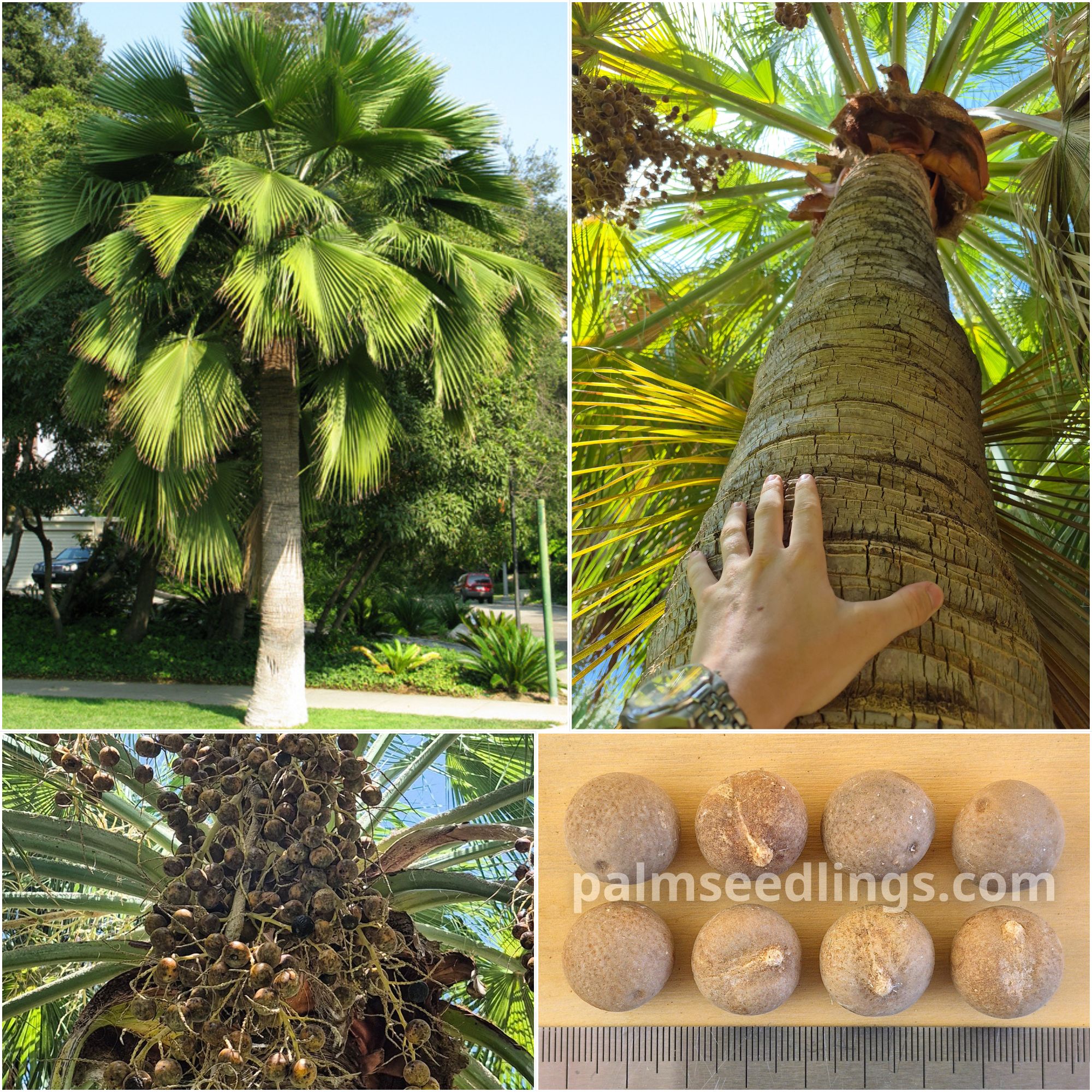 Brahea edulis is a palm with a thick trunk, bright green fan-shaped leaves, and round black fruits.