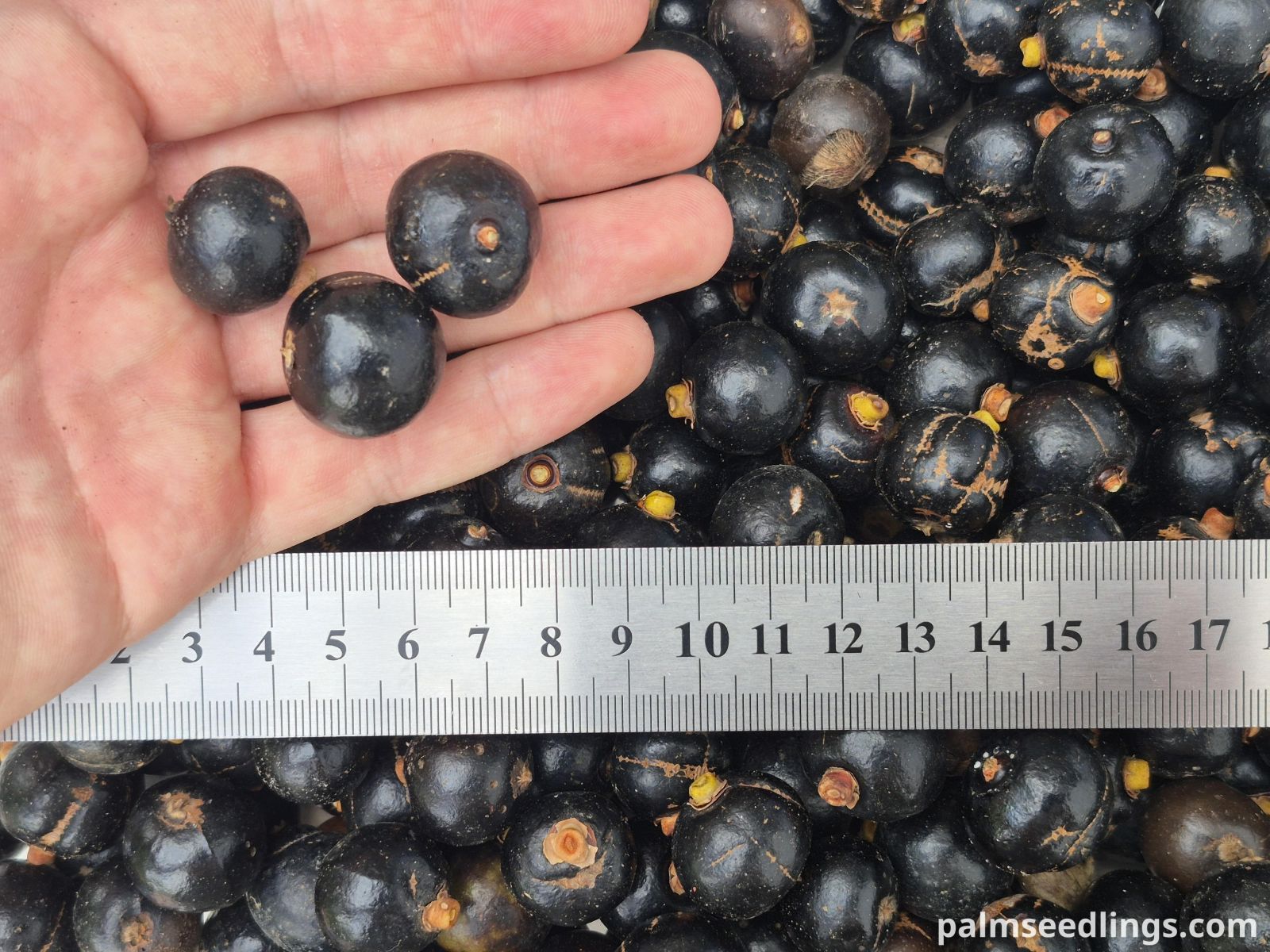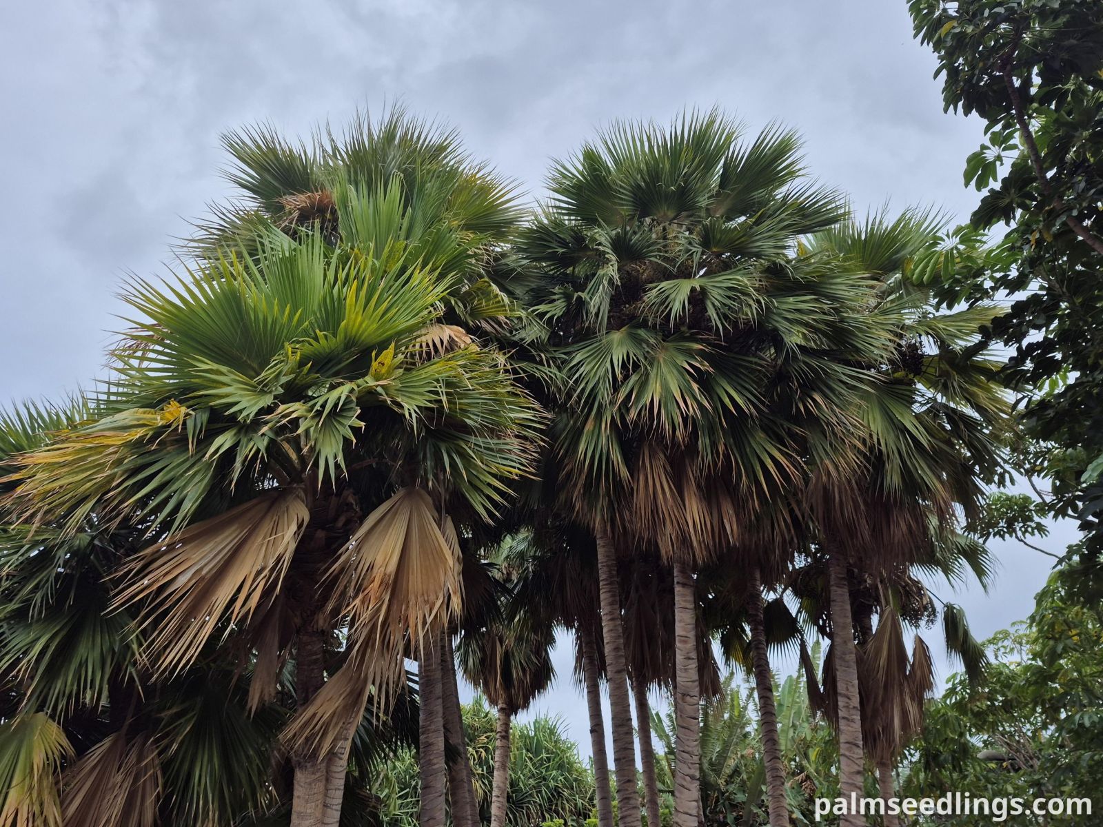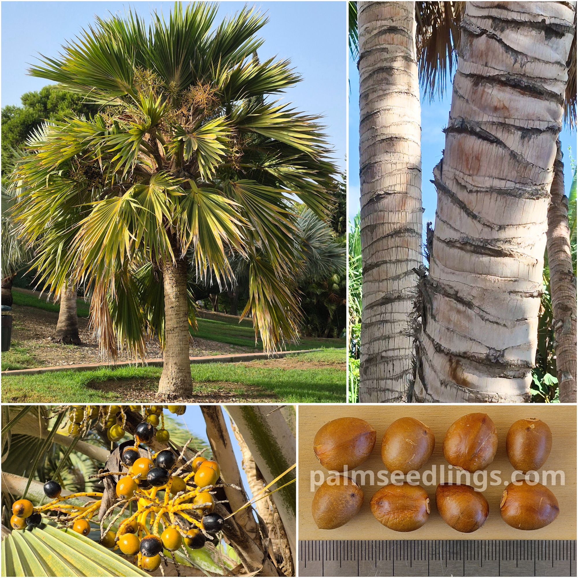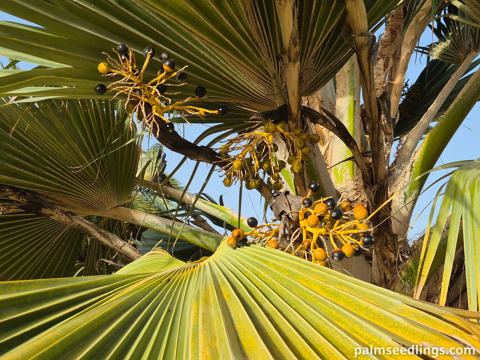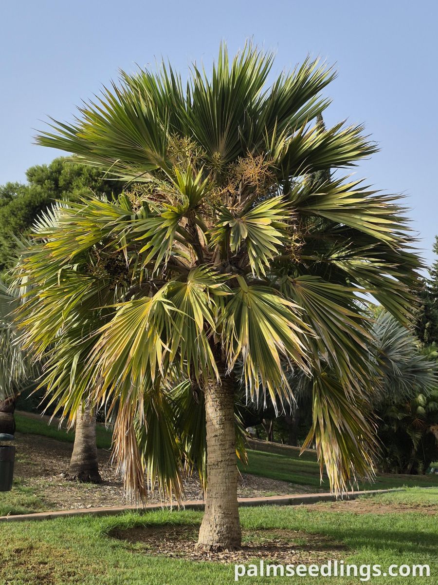 Pritchardia hillebrandii is a solitary fan palm reaching 6-12 m (20-40 ft) in height, with a straight gray trunk 20-35 cm (8-14 in) in diameter. The leaves are large and nearly circular, up to 1.5 m (5 ft) wide, with stiff, deep green upper surfaces and pale undersides finely covered with short, silky hairs. The leaf blades are divided about halfway into narrow segments, giving the crown a neat, rounded appearance. Inflorescences are shorter than or equal to the leaves and produce shiny black fruits about 2.5 cm (1 in) in diameter.