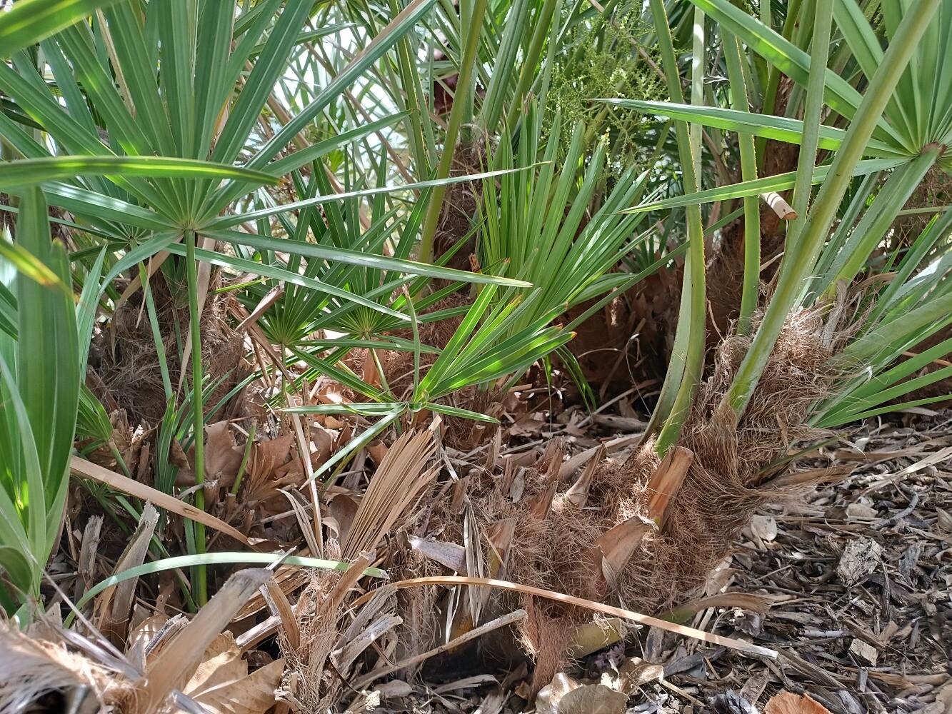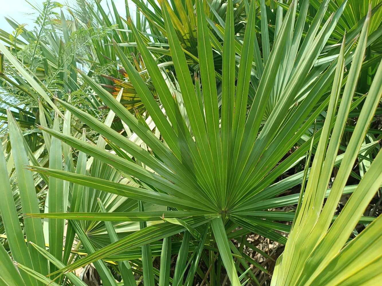 Serenoa repens is a low, clumping fan palm that typically forms dense thickets from creeping, often subterranean stems (rhizomatous growth). Above-ground stems are short, though older plants can develop short to occasionally elongate trunks. The leaves are palmate, 0.6-1.2 m (2-4 ft) across, borne on strongly armed petioles with serrated margins that give the species its common name, “saw palmetto.” Flowering occurs on branched inflorescences, followed by ovoid drupes that ripen from green to black and are harvested for their phytochemical content, widely used in herbal medicine.