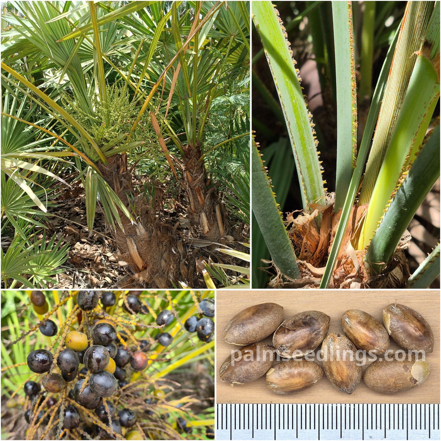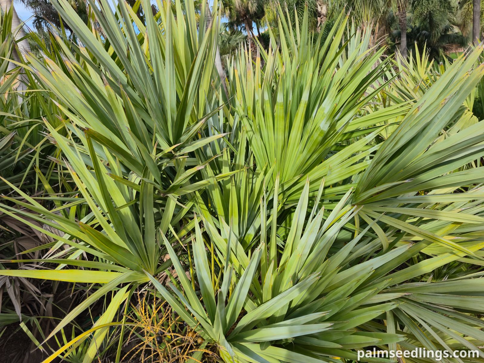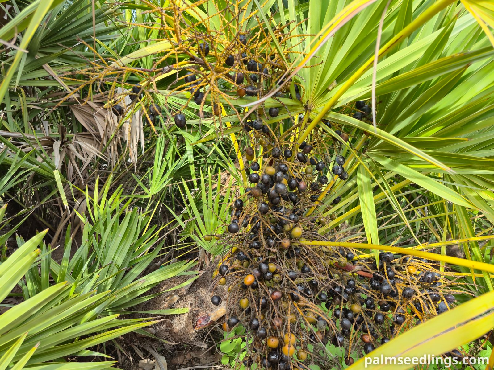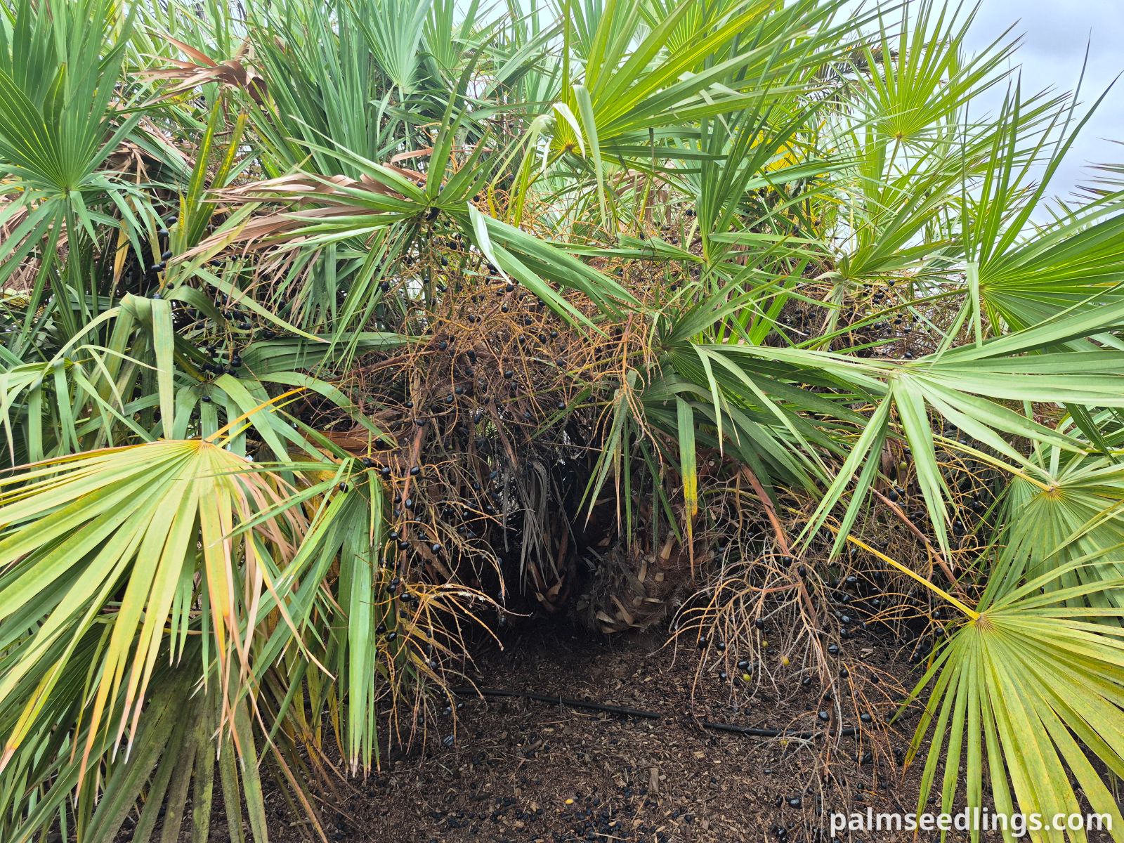 Serenoa repens is a low, clumping fan palm that typically forms dense thickets from creeping, often subterranean stems (rhizomatous growth). Above-ground stems are short, though older plants can develop short to occasionally elongate trunks. The leaves are palmate, 0.6-1.2 m (2-4 ft) across, borne on strongly armed petioles with serrated margins that give the species its common name, “saw palmetto.” Flowering occurs on branched inflorescences, followed by ovoid drupes that ripen from green to black and are harvested for their phytochemical content, widely used in herbal medicine.