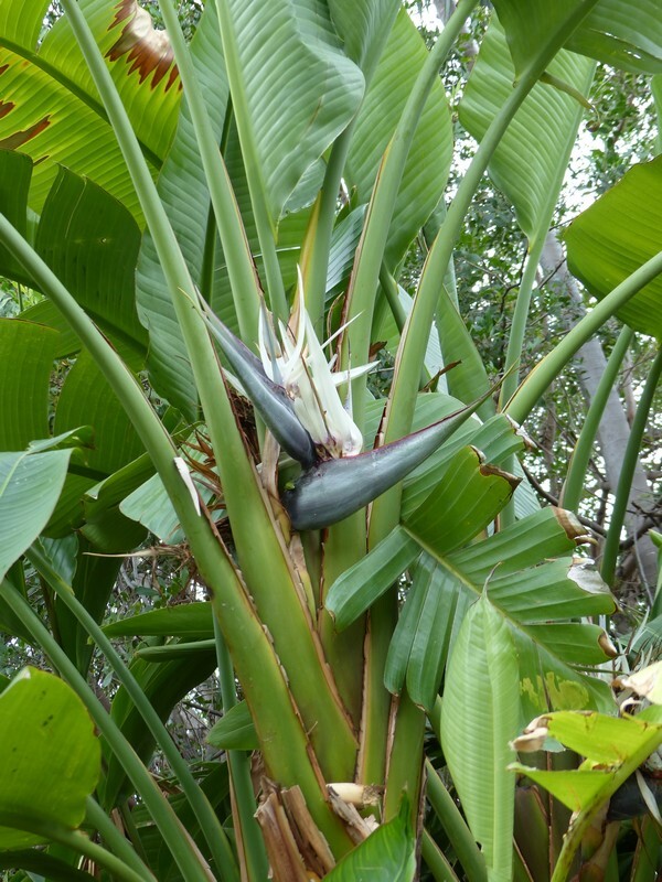 Strelitzia nicolai, commonly known as giant white bird of paradise, is a large, evergreen, tropical plant that grows 6-10 meters (20-33 feet) tall. It forms clumps of tall, banana like stems with large, paddle shaped, dark green leaves up to 1.8 meters (6 feet) long. It produces white and dark blue flowers.