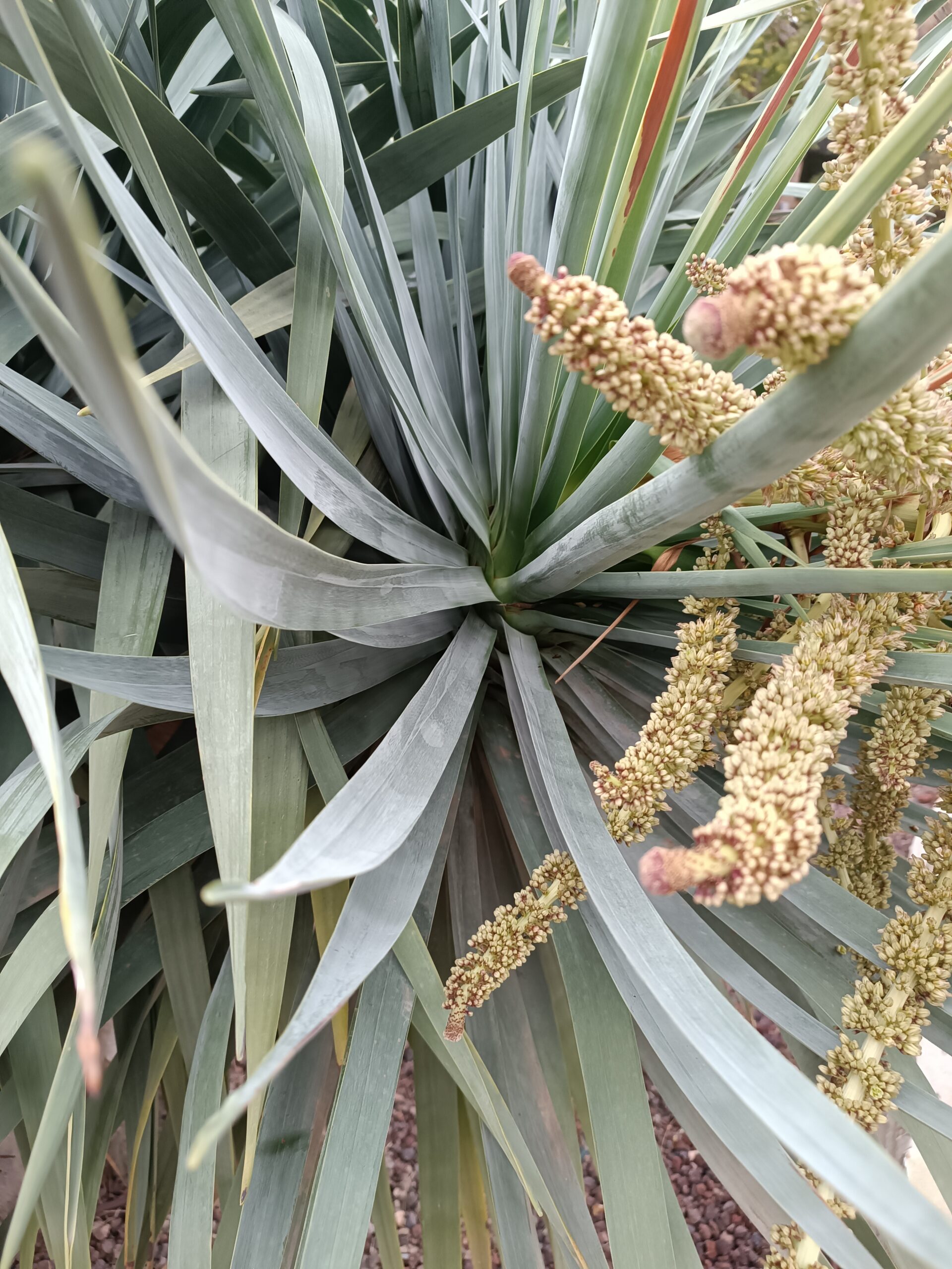 The most outstanding feature of the Dragon Tree is its thick, umbrella-like canopy of stiff, sword-shaped leaves arranged in rosettes. The trunk is stout, grayish-brown, and marked with unique, scaly bark. Over time, the trunk develops a thick, swollen base. The tree’s sap, known as dragon’s blood, is red and has traditional uses.