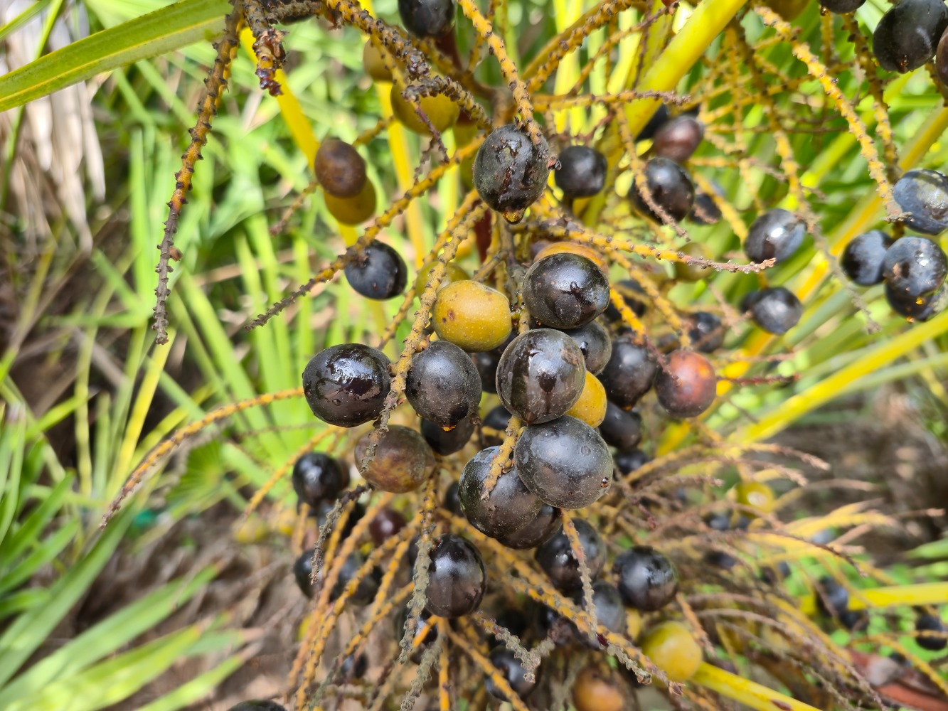 Serenoa repens, commonly known as the saw palmetto, is a low-growing, clumping palm that typically reaches heights of 1–2 meters (3–6 feet). It has multiple creeping trunks covered with old leaf bases, and its fan-shaped fronds are green to silvery-green. The leaf stems are armed with small, sharp teeth, giving the palm its “saw” name. It produces dark, olive-shaped black, purple fruits.